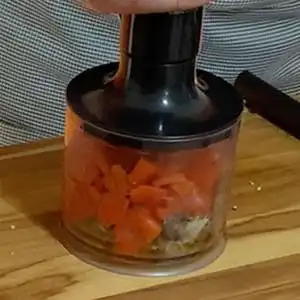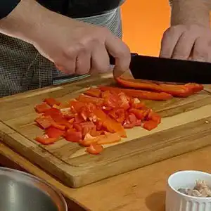 Coloque os cubos de pimentão cozidos, a sardinha (sem o óleo da lata), as anchovas, a pimenta malagueta e a do reino em um processador de alimentos, coloque-o para bater e adicione azeite aos poucos controlando a consistência. Se você utilizar colorau e/ou erva doce, coloque-os junto para processar.