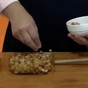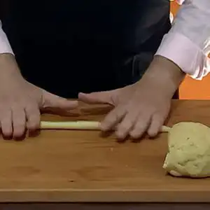 Depois de deixar a massa descansar por cerca de 1 hora, corte-a em pedaços e abra os pedaços (enrolando com as mãos) formando uma espécie de bastão comprido com cerca de 1cm de diâmetro. Corte esse bastão em pequenos pedaços (também com cerca de 1cm) formando uma espécie de bolinha (na verdade parecerá com um pequeno cilindro).